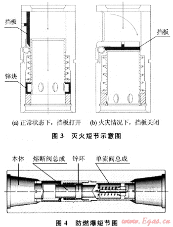 滅火短節(jié)(見(jiàn)圖3、圖4),即鉆柱防火接頭,這是一種低熔點(diǎn)合金制造的閥件,即滅火浮閥,閥內(nèi)裝有一個(gè)鋅環(huán)。在正常情況下,循環(huán)的空氣流動(dòng)壓力使彈簧瓣向下張開(kāi),允許空氣循環(huán)通過(guò)。一旦環(huán)空著火,溫度上升,當(dāng)超過(guò)設(shè)計(jì)溫度時(shí),低熔點(diǎn)合金鋅環(huán)熔化使一個(gè)襯套封住空氣流道,關(guān)閉閥門(mén),停止向井底循環(huán)補(bǔ)充空氣,從而切斷氣源使火熄滅。