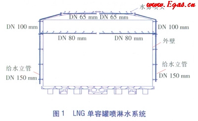 在罐頂及罐壁周圍各設一圈供水管,均一分為二呈半環(huán)狀,罐頂供水環(huán)管為DN 65mm,罐壁供水環(huán)管為DN 80mm。兩個半環(huán)分別由兩條DN 150mm的給水立管供水(給水立管引自廠站內(nèi)的環(huán)狀消防管網(wǎng)),每條給水立管都由設在圍堰外閥門間內(nèi)的電動閥控制,當發(fā)生火災時,可在控制室操作。該LNG單容罐的噴淋水系統(tǒng)見圖1。