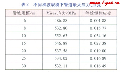 計算滑坡規(guī)模分別為6m、8m、10m、15m、20m、25m和30m工況下管道的最大Mises應(yīng)力和最大等效塑性應(yīng)變(見表2),隨著滑坡規(guī)模的不斷擴大,管道沿滑坡體滑動方向的應(yīng)力、應(yīng)變逐漸增加,當滑坡規(guī)模達到一定程度后,管道的應(yīng)力、應(yīng)變趨于穩(wěn)定并開始降低。該現(xiàn)象可以解釋當滑坡規(guī)模較大時,管道的彎曲程度減緩,使得彎曲應(yīng)力降低,一定程度上減小了組合應(yīng)力。