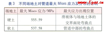 計算兩種情況下管道的最大應(yīng)力及其位置(見表3),當場地土較硬時最大應(yīng)力出現(xiàn)在滑坡體與場地土體交界處,即在A點和B點的彎曲作用明顯;而當場地土較軟時管道最大Mises應(yīng)力稍小一些,且最大應(yīng)力出現(xiàn)在管道的中部,即較軟的場地土可以使管道產(chǎn)生更大范圍的橫向位移,一定程度上緩解了彎曲應(yīng)力,反而使其最大Mises應(yīng)力有所降低。