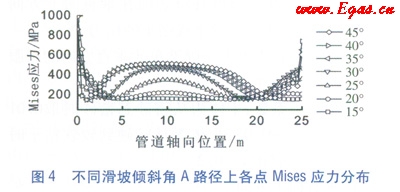 將滑坡規(guī)模固定為25m,滑坡傾斜角分別為15°、20°、25°、30°、35°、40°和45°,A路徑上各點的Mises應(yīng)力值見圖4。不同傾斜角下,管道的應(yīng)力集中區(qū)均為管道兩端和中下部。但隨著滑坡傾斜角的增加,管道的三個應(yīng)力集中區(qū)范圍逐漸增大,特別是管道中段的應(yīng)力集中區(qū)向兩端延伸,且最大應(yīng)力值也隨之增加。