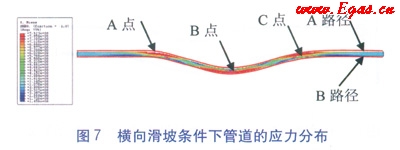 模型中滑坡體取粘土,土體剪切強度為50kPa,滑坡傾斜角為30°,滑坡規(guī)模為15m,滑坡兩側(cè)場地土各取20m。以輸油管道為計算對象,管道外徑為711mm,壁厚為10.3mm,管道材質(zhì)為X70鋼,管道內(nèi)壓為8MPa,管道埋深1.8m,管—土摩擦系數(shù)為0.65。在ABAQUS軟件中繪制出管道的Mises應(yīng)力云圖(見圖7,單位為MPa),管道共存在三個應(yīng)力集中區(qū)域(A點、B點和C點),即管道中部和滑坡體與兩側(cè)場地土分界面處的兩個彎曲區(qū)域,但管段彎曲方向內(nèi)外兩側(cè)由于拉壓應(yīng)力和彎曲應(yīng)力組合而有所不同,沿管道軸向根據(jù)滑坡移動方向在管道兩側(cè)選擇A路徑和B路徑為分析對象。