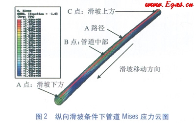 模型中滑坡體取粘土,土體剪切強度為50kPa,滑坡傾斜角為30°,滑坡規(guī)模為25m。以輸油管道為例,管道外徑為711mm,壁厚為10.3mm,管道材質(zhì)為X70鋼,管道內(nèi)壓8MPa,管道埋深1.8m,管—土間的摩擦系數(shù)為0.65。在ABAQUS軟件中繪制出管道的Mises應(yīng)力云圖(見圖2,單位為MPa),并沿管道軸向在管道上取A點、B點、C點和經(jīng)過以上三點的A路徑為參考位置和分析對象。