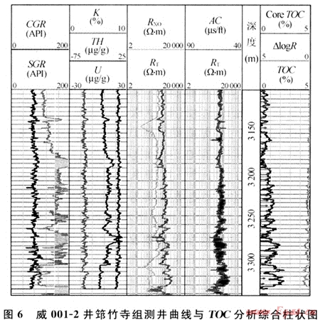 如前所述,隨深度的增加,筇竹寺組和龍馬溪組頁巖的顏色均具有自上而下逐漸加深的特點,而其自然伽馬值和有機質豐度也隨之逐漸增高(圖6)。威001-2是威遠構造上的一口新井,筇竹寺組的伽馬值在3175m以下明顯增加,一般都大于150API,而無論是根據(jù)測井曲線△㏒R(Passey,1989)計算的還是采用巖屑實測的TOC值,均顯示在該深度段以下一般都大于1.0%且逐漸增加的特征(圖6)。長寧構造上最近由中石油北京勘探開發(fā)研究院鉆探的1口淺井也顯示出龍馬溪組頁巖所具有的上述特征。該口淺井鉆遇了龍馬溪組中下部黑色頁巖層,110m深度段以上的TOC值一般在1.5%~2.5%之間,該深度以下TOC值劇增,均大于3%,最高約9%。