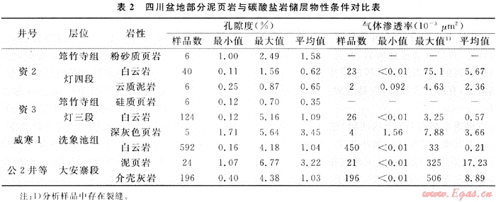 眾所周知,泥頁巖本身的孔滲性超低而致密,故一般在油氣藏的形成中起封蓋作用。但是,在四川盆地多套含油氣層系中,泥頁巖與同層的碳酸鹽巖儲層相比,其物性條件相差無幾(表2)。特別是在有裂縫存在的條件下,泥頁巖往往也具有較高的滲透能力,可形成·種非常規(guī)油氣層——泥頁巖裂縫性油氣層(例如侏羅系大安寨和涼高山油氣層)。在四川盆地今后的非常規(guī)油氣勘探中,理應重視這種特殊類型的泥頁巖儲集層。