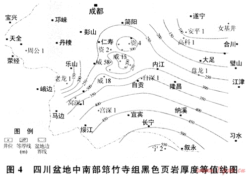 下古生界黑色頁巖集中分布在下寒武統(tǒng)筇竹寺組、下奧陶統(tǒng)大灣組和五峰組及下志留統(tǒng)龍馬溪組等4個層段中。大灣組(或大乘寺組)黑色頁巖在盆地西南部較發(fā)育,其厚度一般在45~140m,特別是在威遠地區(qū)分布穩(wěn)定,也是未來下古生界頁巖氣勘探值得重視的一套目的層。五峰組黑色頁巖雖分布穩(wěn)定,但厚度較薄,一般只有幾米,且與龍馬溪組整合接觸,特征類似。限于資料,筆者僅針對筇竹寺組和龍馬溪組兩套黑色頁巖開展分析與討論。