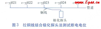 c.在c-yj023測試樁連接銅線,拉銅線到c-yj024測試樁附近,連接c-yj024測試樁附近的極化探頭,測得斷電電位%,極化探頭的埋設(shè)位置與在c-yj024測試樁直接測試斷電電位時(shí)埋設(shè)位置相同(測試方法見圖3),測試數(shù)據(jù)見表3。