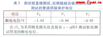 b.采用極化探頭法,在c-yj024測試樁上直接測試c-yj024測試樁處管道斷電電位U(測試方法見圖2),測試數(shù)據(jù)見表3,測試數(shù)據(jù)用來比對分析拉銅線結(jié)合極化探頭法的準(zhǔn)確、可靠性。