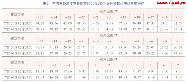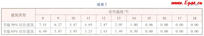 根據(jù)文獻[1]及GB 50736—2012《民用建筑供暖通風(fēng)與空氣調(diào)節(jié)設(shè)計規(guī)范》、JCJ 26—2010《嚴(yán)寒和寒冷地區(qū)民用建筑節(jié)能設(shè)計標(biāo)準(zhǔn)》、JGJ 26—5《民用建筑節(jié)能設(shè)計標(biāo)準(zhǔn)(供暖居住建筑部分)》規(guī)定的汁算參數(shù),以烏魯木齊市供熱區(qū)域內(nèi)某居住建筑為例,進行能耗分析。該建筑坐北朝南,共6層,建筑高度為16.8m,總建筑面積為4112.64m2,體形系數(shù)為0.28。節(jié)能50%居住建筑外墻傳熱系數(shù)為0.43W/(m2·K),外窗的傳熱系數(shù)為2.47W/(m2·K);節(jié)能65%居住建筑外墻傳熱系數(shù)為0.35W/(m2·K),外窗傳熱系數(shù)為1.8W/(m2·K)。計算得出不同室外溫度(室外溫度取整數(shù))時,該居住建筑分別節(jié)能65%、50%時的供暖熱負(fù)荷指標(biāo),計算結(jié)果見表2。當(dāng)室外溫度達到16℃時,鍋爐停止供暖,熱負(fù)荷指標(biāo)為0,但由于烏魯木齊的晝夜溫差可逾20℃,因此存在白天停止供暖,傍晚及夜間又恢復(fù)供暖的情況。