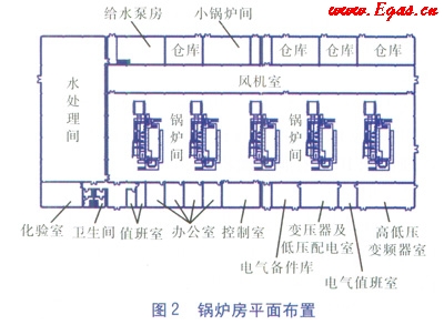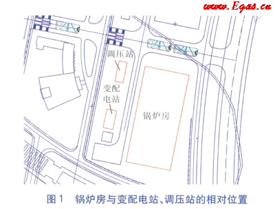 鍋爐房與變配電站、調(diào)壓站的相對位置見圖1,鍋爐房平面布置見圖2。