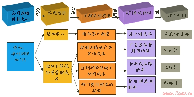 必須先確定公司的戰(zhàn)略目標(biāo)或年度目標(biāo)。在公司戰(zhàn)略目標(biāo)或年度目標(biāo)確定后再進(jìn)行層層分析。從一個(gè)具體的戰(zhàn)略目標(biāo)或年度目標(biāo)到特定部門的考核指標(biāo),要經(jīng)過一系列的過程(見下圖)。
