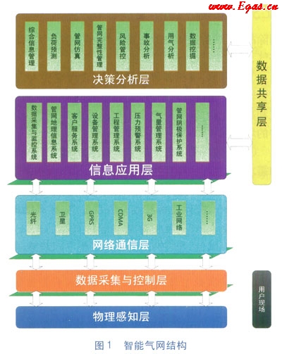 智能氣網(wǎng)涵蓋了天然氣生產(chǎn)、儲存、輸配和終端用戶使用的全過程。智能氣網(wǎng)通過傳感器把管網(wǎng)各種設(shè)備、生產(chǎn)工藝參數(shù)、資產(chǎn)聯(lián)系在一起,形成一個完整的數(shù)據(jù)流和信息流,通過對數(shù)據(jù)信息進行整合、分析和挖掘,以此來降低運行成本,提高整個氣網(wǎng)的安全性以及優(yōu)化運營管理流程。
