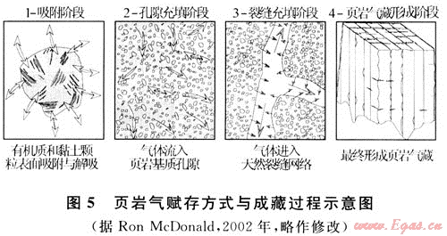頁巖氣藏中氣體的賦存形式多種多樣,其中絕大部分是以吸附氣的形式賦存于頁巖內(nèi)有機質(zhì)和黏土顆粒的表面,這與煤層氣相似。吸附氣量與有機碳含量、地層壓力等因素有關(guān)。游離氣則聚集在頁巖基質(zhì)孔隙或裂縫(主要為微裂縫)中,這與常規(guī)氣藏中的天然氣相似。此外,可能還有極少部分頁巖氣以溶解氣形式存在于頁巖孔隙束縛水或瀝青中。因此,頁巖氣的形成機理兼具煤層吸附氣和常規(guī)天然氣兩者特征,為不間斷充注、連續(xù)聚集成藏(圖5)。在頁巖氣成藏過程中,隨天然氣富集量增加,其賦存方式發(fā)生改變,完整的頁巖氣藏充注與成藏過程可分為4個階段[4]。第一階段為天然氣生成與吸附階段,該階段形成的頁巖氣藏具有與煤層氣相似的成藏機理;第二階段為吸附氣量(包括部分溶解氣量)達(dá)到飽和時,富余氣體解吸或直接充注到頁巖基質(zhì)孔隙中(也不排除少量直接進(jìn)入了微裂縫中),其富集機理類似于孔隙型儲層中天然氣的聚集;第三階段是隨著大量氣體的生成,頁巖基質(zhì)孔隙內(nèi)溫度、壓力升高,出現(xiàn)巖石造縫以及天然氣以游離狀態(tài)進(jìn)入頁巖裂縫中成藏;經(jīng)過前述三個過程后,天然氣最終以吸附氣和游離氣的形式富集形成頁巖氣藏,即頁巖氣藏形成階段。