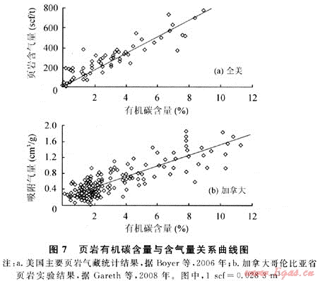 2) 有機碳含量愈高,氣藏富集程度愈高。商業(yè)性頁巖氣藏需要達(dá)到頁巖有機碳含量最低界限標(biāo)準(zhǔn)。斯倫貝謝公司對北美頁巖氣盆地的研究認(rèn)為,頁巖氣藏的有機碳含量最低標(biāo)準(zhǔn)原則上應(yīng)大于2.0%(表4)。因此,有機碳含量是頁巖氣藏評價中的一個重要指標(biāo),它既是頁巖生氣的物質(zhì)基礎(chǔ),決定頁巖的生烴強度,也是頁巖吸附氣的載體之一,決定頁巖的吸附氣大小,還是頁巖孔隙空間增加的重要因素之一,決定頁巖新增游離氣的能力。在相同的地質(zhì)條件及演化階段下,頁巖生烴強度、吸附氣量大小及新增游離氣能力與頁巖中有機碳含量呈明顯的線性正相關(guān)性。實驗分析結(jié)果表明,頁巖含氣量(吸附氣及游離氣總量)隨頁巖有機碳含量的增加而增大(圖7-a)。對加拿大哥倫比亞省下白堊統(tǒng)BuckingHorse組202塊頁巖樣品的等溫吸附實驗結(jié)果也同樣表明[7],頁巖有機碳含量與甲烷吸附量之間呈正相關(guān)分布(圖7-b)。此外,不同母質(zhì)類型、不同演化程度的頁巖,其等溫吸附曲線也存在明顯差別。頁巖有機質(zhì)類型越好,甲烷的吸附量越大[7]。但與此同時,圖6、圖7中也存在一些異常現(xiàn)象,說明頁巖含氣量大小不僅僅受有機碳含量的影響,還可能受其他多種因素的影響,如黏土成分及含量、有機質(zhì)熱成熟度、頁巖含水量等。對此,尚需作進(jìn)一步的深入研究。