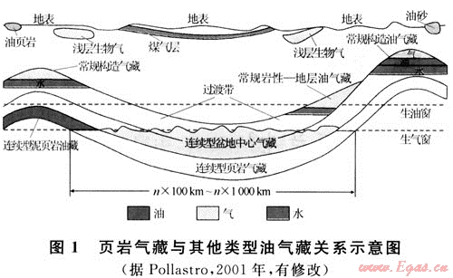 2) 無明顯圈閉:傳統(tǒng)上的常規(guī)油氣均聚集在圈閉中,圈閉是油氣藏形成的基礎(chǔ),決定著油氣藏的基本特征以及勘探方法。頁巖氣藏雖在字面上還稱之為藏,實則沒有藏的邊界,即頁巖氣不是聚集在某個圈閉中成藏的,而是包含盆地中已經(jīng)進(jìn)入生氣窗范圍內(nèi)的所有烴源巖中皆可成藏(圖1)。常規(guī)油氣藏,即使是巖性油氣藏,都是在一定的構(gòu)造背景下形成的,而頁巖氣藏不受構(gòu)造因素的控制。