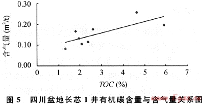 頁巖氣的勘探生產(chǎn)價值取決于其中游離氣和吸附氣的含量,游離氣的含量高低與其構(gòu)造保存條件密切相關(guān),而吸附氣含量受溫度、壓力等環(huán)境因素影響,在相同情況下,吸附氣量高低與有機(jī)質(zhì)含量呈正相關(guān)。上揚(yáng)子地區(qū)志留系烴源巖有機(jī)質(zhì)豐度高,預(yù)計將會在構(gòu)造保存條件差異較大的地區(qū)分別形成不同含氣量及含氣特點的頁巖氣聚集。在四川盆地,除已發(fā)現(xiàn)過去的老井在鉆探志留系頁巖段時具有豐富的氣顯示之外,目前完鉆的長芯1井初步分析結(jié)果顯示,在埋深淺于150 122龍馬溪組頁巖層段內(nèi),同樣發(fā)現(xiàn)了頁巖氣存在的證據(jù)(表2)。8個頁巖巖心的含氣量實驗結(jié)果顯示(解析溫度70℃),每噸巖石含氣量為0.08~0.25m3,平均為0.15m3/t。另從110m和120m巖樣的甲烷碳同位素分別為-40.2‰和-52.3‰來看,頁巖氣應(yīng)為熱成因的天然氣。有機(jī)質(zhì)豐度與含氣量的關(guān)系則顯示(圖5),同美國頁巖一樣,同樣具有有機(jī)碳含量與含氣量呈正相關(guān)的關(guān)系,即有機(jī)質(zhì)豐度越高,含氣量越大。