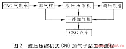 液壓壓縮機式CNG加氣子站是利用液壓壓縮機從氣瓶車中吸氣,加壓后通過站內(nèi)的三線雙槍加氣機把高壓天然氣充入CNG汽車的車載儲氣瓶內(nèi),達(dá)到給汽車加氣的目的。