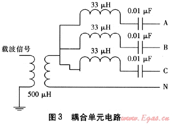 圖2中耦合單元電路見圖3。這個(gè)電路實(shí)際上是通過一個(gè)電感為500μH、匝數(shù)比為1:1的高頻耦合變壓器完成數(shù)據(jù)從載波通信芯片到電力線或電力線到載波通信芯片之間的傳遞。同時(shí)它還保證了電力線和通信電路之間強(qiáng)電和弱電的電氣隔離。在耦合變壓器前分別用三組帶通濾波器直接連接到電力線的A、B、C三相上。耦合變壓器的另一個(gè)輸出端直接和電力線的零線連接。濾波器的電感為33μH,電容為0.01μF。電感和電容串聯(lián)在270kHz的電路時(shí)構(gòu)成串聯(lián)諧振。對載波信號(hào)來說,它的阻抗幾乎為0,但對于工頻的信號(hào)阻抗很大。因此,這個(gè)電路能強(qiáng)烈抑制工頻信號(hào)的干擾,但能讓載波信號(hào)順利通過。