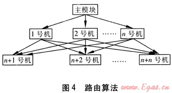路由算法見圖4。主模塊開始工作后,只要沒有主站命令就開始根據(jù)自己儲(chǔ)存的從模塊的檔案逐個(gè)去搜索下面的加油機(jī)(即發(fā)一幀帶有目的地址的數(shù)據(jù)幀,以下簡稱握手幀)。從模塊收到握手幀后,把握手幀中的地址和自己的地址比較,地址相同則返回一個(gè)握手應(yīng)答幀,完成一次握手。例如圖4中主模塊和1號(hào)機(jī)、2號(hào)機(jī)、n號(hào)機(jī)等握手。對于直接通信不到的從模塊,如圖4中的n+1號(hào)機(jī)等,則通過1號(hào)機(jī)、2號(hào)機(jī)、n號(hào)機(jī)等能直接通信到的從模塊發(fā)中繼幀和它們握手。主模塊的MCU會(huì)把這個(gè)路由搜索結(jié)果生成一個(gè)鏈表暫時(shí)存在SRAM內(nèi),然后繼續(xù)學(xué)習(xí)。每1h把這個(gè)鏈表儲(chǔ)存到EEPROM一次。這是因?yàn)锳Tmega64L內(nèi)的EEPROM只有10×104次的擦寫次數(shù),如果每次都寫到EEPROM里,那么用不了多長時(shí)間EEPROM就會(huì)被寫壞。電力線的通信狀況雖然有變化,但也不是時(shí)時(shí)刻刻都在變。所以,也沒必要時(shí)時(shí)刻刻都放到EEPROM。通過這樣設(shè)計(jì),EEPROM的壽命可延長至10年以上。為提高通信可靠性,一般會(huì)給從模塊多保存幾條路由路徑,以備冗余[2]。