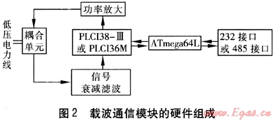 載波通信模塊的硬件組成見圖2。整個(gè)模塊的核心就是微控制器(Micro Control Unit,MCU)ATmega64L,它是美國愛特梅爾公司生產(chǎn)的AVR單片機(jī)。它芯片內(nèi)有64kb的程序儲(chǔ)存器(以下簡稱FlashROM),4kb的靜態(tài)隨機(jī)儲(chǔ)存器(以下稱SRAM),2kb的電可擦除可編程只讀儲(chǔ)存器(以下簡稱EEPROM),兩個(gè)通用異步收發(fā)器(以下稱USART),內(nèi)部還集成了看門狗。這些特點(diǎn)使這個(gè)MCU非常適合用在這個(gè)系統(tǒng)中。MCU的一個(gè)USART設(shè)計(jì)成232接口或485接口。另一個(gè)USART直接和PLC138-Ⅲ或PLC136M的串口相連。MCU芯片內(nèi)的EEPROM可以儲(chǔ)存一些掉電非易失數(shù)據(jù)[1]。
