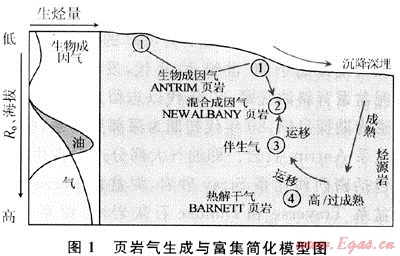 頁巖氣生烴過程與常規(guī)油氣并無區(qū)別,但儲(chǔ)集方式、富集條件以及氣藏宏觀分布差異較大。從天然氣賦存狀態(tài)來看,頁巖氣包含了吸附氣部分,并且不同地質(zhì)條件下游離氣、吸附氣二者相對(duì)含量變化大,開采方案、生產(chǎn)曲線也呈現(xiàn)不同特征;從油氣成藏動(dòng)力條件以及宏觀特征上看,常規(guī)油氣運(yùn)移過程中需要上傾方向存在與輸導(dǎo)體系相關(guān)的構(gòu)造高部位,離散分布的低勢(shì)能區(qū)域是成藏有利目標(biāo),浮力是天然氣運(yùn)移的主要?jiǎng)恿?,天然氣不斷運(yùn)聚,氣水界面隨之下移,所以下傾方向往往是水層,而連續(xù)式富集的頁巖氣鮮受水動(dòng)力影響,多區(qū)域性分布于坳陷中[12],如Appalachian、Michigan和Illinois盆地泥盆系含氣頁巖覆蓋面積約71200km2,屬于自生自儲(chǔ)巖性氣藏,沒有明顯的氣水界面。