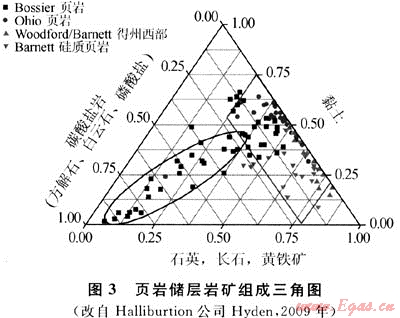 裂縫發(fā)育受內(nèi)、外因控制。外因主要與生烴過程、地層孔隙壓力、各向異性的水平壓力、斷層與褶皺等構(gòu)造作用相關(guān),內(nèi)因主要取決于頁巖礦物學(xué)特征。圖3展示了已開發(fā)頁巖的兩個(gè)分布區(qū)域:Bossier頁巖大都位于石英、長石和黃鐵礦含量低于40%,碳酸鹽巖含量大于25%,黏土礦物低于50%區(qū)間;Ohio、Woodford/Barnett頁巖位于碳酸鹽含量低于25%,石英、長石和黃鐵礦含量20%~80%,黏土含量在20%~80%區(qū)間,其中Barnett硅質(zhì)頁巖黏土礦物通常小于50%,石英等含量超過40%,Arkoma盆地Woodford頁巖與其相近。即頁巖膨脹性黏土礦物含量較少,硅質(zhì)、碳酸鹽巖等礦物較多時(shí)(Fort Worth盆地Barnett頁巖典型值為40%~60%),巖石脆性與造縫能力強(qiáng),裂縫網(wǎng)絡(luò)容易產(chǎn)生。