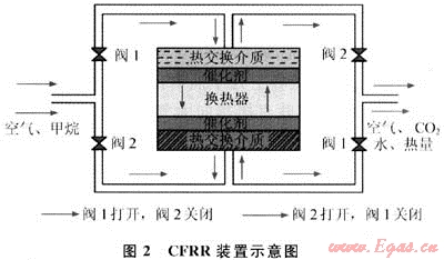 開(kāi)始運(yùn)行時(shí),電熱元件對(duì)熱交換介質(zhì)進(jìn)行預(yù)熱,使之達(dá)到反應(yīng)所需要的溫度。一個(gè)循環(huán)包括兩次風(fēng)流轉(zhuǎn)向,每一次轉(zhuǎn)向稱為一個(gè)半循環(huán)。在第一個(gè)半循環(huán)中,甲烷和空氣的混合物以常溫通入反應(yīng)器,閥1打開(kāi),閥2關(guān)閉,風(fēng)流從反應(yīng)器頂部流向底部,當(dāng)空氣和甲烷的混合物到達(dá)熱交換介質(zhì)時(shí)發(fā)生氧化反應(yīng),放出熱量。產(chǎn)生的熱量及反應(yīng)產(chǎn)物持續(xù)通過(guò)反應(yīng)器的出口,出口處的熱交換介質(zhì)不斷吸熱,從而溫度不斷升高。而入風(fēng)側(cè)因風(fēng)流以常溫通過(guò),熱交換介質(zhì)不斷被冷卻,當(dāng)冷卻到一定溫度時(shí),反應(yīng)器自動(dòng)轉(zhuǎn)換風(fēng)流方向,進(jìn)入第二個(gè)半循環(huán)。風(fēng)流從高溫側(cè)進(jìn)入,并吸收熱交換介質(zhì)的熱量,從而達(dá)到自燃溫度。反應(yīng)生成的熱量,一部分被熱交換器吸收,另一部分用于補(bǔ)償熱損失,從而往復(fù)循環(huán)。