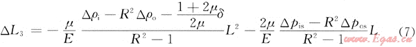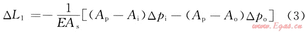 當測試管柱內流體流動而環(huán)形空間的流體不流動一時,其管柱長度變化△L3為: