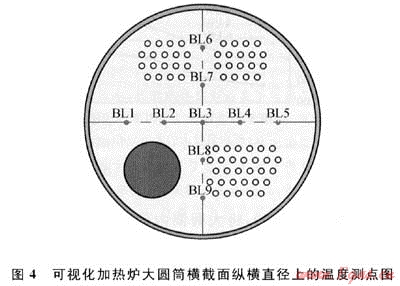 為對上述結(jié)論加以驗(yàn)證,進(jìn)行了大圓筒內(nèi)介質(zhì)流動的可視化流場試驗(yàn),試驗(yàn)?zāi)康氖菍?shí)測數(shù)據(jù)和觀察到的情況進(jìn)行分析,為加熱爐實(shí)物的試驗(yàn)和實(shí)際設(shè)計打基礎(chǔ)??紤]到大圓筒內(nèi)流場分布可能較紊亂,因此采用可視手段,目的是能夠觀察到流場的基本動向。試驗(yàn)用可視化加熱爐大圓筒外殼由有機(jī)玻璃構(gòu)成,火筒和煙管束由黃銅制成,布置于大圓筒下方,用電加熱器加熱空氣模擬煙氣流入火筒經(jīng)轉(zhuǎn)向室流入煙管束然后排入大氣,電加熱器采用2kW、4kW、6kw的功率,由此形成熱風(fēng)循環(huán)系統(tǒng);大圓筒內(nèi)中間載熱介質(zhì)采用水,因水量較大,為使試驗(yàn)時介質(zhì)水的溫度能迅速達(dá)到要求,設(shè)計了預(yù)熱水系統(tǒng),即專門配備了預(yù)熱水箱,內(nèi)有電加熱器能較快地加熱介質(zhì)水,使其達(dá)到預(yù)定溫度后再注入大圓筒內(nèi);對流管束受熱面由紫銅管制成,布置于大圓筒上方,對流管束彎成“U”型,一端為進(jìn)口,一端為出口,被加熱流體為空氣,為控制其初始溫度,在冷風(fēng)系統(tǒng)中配有空調(diào)器以降低空氣溫度。為測量大圓筒圓截面上流場的溫度分布,在圓截面的縱軸和橫軸上布置了溫度測點(diǎn),編號分別為BL1~9,如圖4所示。試驗(yàn)時同時開啟冷風(fēng)及熱風(fēng)循環(huán)系統(tǒng),并通過預(yù)熱水系統(tǒng)將大圓筒內(nèi)中間載熱介質(zhì)水的溫度控制在41.7℃和63℃,以觀察流場,并測試不同加熱功率對大圓筒內(nèi)水溫的影響。