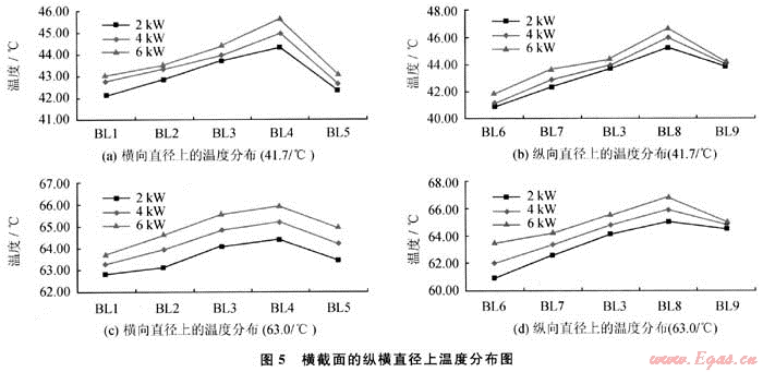 測試結(jié)果由圖5所示,在不同的加熱功率下,橫軸上測點(diǎn)BL4的溫度最高,縱軸上測點(diǎn)BL8的溫度最高,因?yàn)檫@兩個測點(diǎn)離火筒位置最近,而火筒是模擬煙氣的入口,氣流溫度最高,測點(diǎn)BL3至BL4的溫度變化幅度在中間載熱介質(zhì)水溫為41.7℃時比為63℃時大,其原因是介質(zhì)水溫較低時,與火筒內(nèi)的氣流溫差較大,使火筒壁面附近對流換熱加大,介質(zhì)水溫上升快,因此火筒周圍形成了較強(qiáng)的上升流;而介質(zhì)水溫為63℃時,由于介質(zhì)與氣流間的溫差較小,對流換熱相對弱,上升流的動力也小??v軸上各測點(diǎn)溫度顯示:在不同的加熱功率和中間載熱介質(zhì)溫度下,溫度分層現(xiàn)象明顯,測點(diǎn)BL8溫度最高,自BL3、BL7至BL6依次降低,而BL9比BL8低,但高于其他測點(diǎn),這與流場換熱狀況相吻合;測點(diǎn)BL6的溫度,在加熱功率較小時,會低于介質(zhì)溫度,表明在此附近區(qū)域加熱氣流提供的熱量不足,被加熱氣流只能吸收中間載熱介質(zhì)的初始熱量達(dá)到升溫的目的。試驗(yàn)結(jié)果證實(shí)了數(shù)值計算反映的大圓筒中間載熱介質(zhì)天然氣加熱爐流場中存在的問題。
