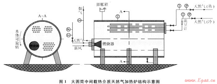 1) 大圓筒中間載熱介質(zhì)天然氣加熱爐是目前應(yīng)用較廣的天然氣加熱設(shè)備,但數(shù)值計算和試驗(yàn)結(jié)果均表明:大圓筒內(nèi)對稱布置加熱面和受熱面的結(jié)構(gòu)不利于熱流場的形成。