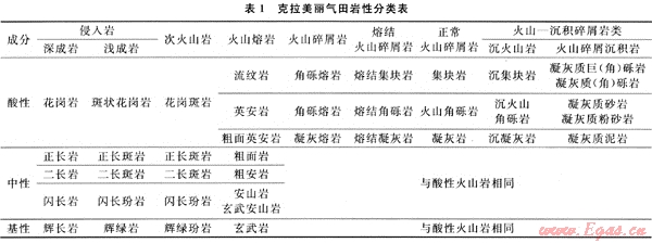 按照“成分+結(jié)構(gòu)、構(gòu)造+成因”的分類原則[1],對克拉美麗氣田石炭系火山巖巖石進(jìn)行了分類及命名,共分為7大類、28小類、上百種巖石類型(見表1)。