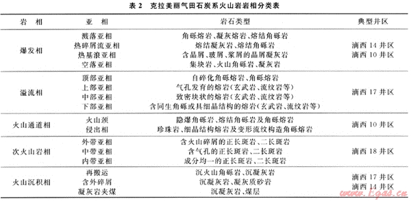 克拉美麗氣田石炭系屬于以中心式為主、裂隙式為輔的火山噴發(fā)模式,共發(fā)育3大類11種亞類32種巖石類型,包括爆發(fā)相的火山碎屑熔巖、熔結(jié)火山碎屑巖、火山碎屑巖,溢流相的玄武巖、安山巖、流紋巖,次火山巖相的正長斑巖、二長斑巖等?;鹕絿姲l(fā)能量較強,內(nèi)部火山機構(gòu)正向隆起特征清晰。