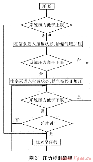 壓力控制是通過(guò)控制柱塞泵的工作狀態(tài)和工作時(shí)間,使儲(chǔ)氣瓶中CNG的壓力穩(wěn)定在上限和下限之間,圖3是壓力控制流程。