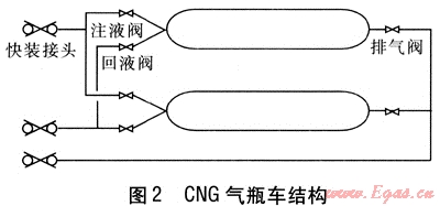 本文中的CNG氣瓶車是在普通CNG氣瓶車基礎(chǔ)上改裝而成的,其結(jié)構(gòu)見圖2。每輛CNG氣瓶車都有8個(gè)儲(chǔ)氣瓶,為了簡(jiǎn)化圖形,圖中只畫出2個(gè)儲(chǔ)氣瓶。儲(chǔ)氣瓶?jī)啥说淖⒁洪y、回液閥和排氣閥都是常閉型氣動(dòng)球閥,向氣動(dòng)球閥的氣缸充壓縮空氣則氣動(dòng)球閥開啟;氣缸泄氣則氣動(dòng)球閥關(guān)閉。
