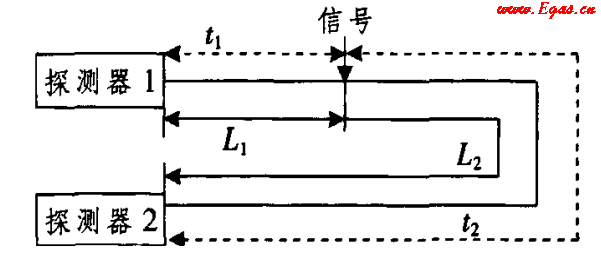 當(dāng)外界振動(dòng)信號(hào)作用于M—Z光纖干涉系統(tǒng)的兩個(gè)干涉臂時(shí),傳感光分別向左右兩個(gè)方向傳輸至探測(cè)器1和探測(cè)器2(見(jiàn)圖 2)。檢測(cè)比較兩組干涉光的時(shí)間差即可判斷振動(dòng)事件發(fā)生的位置(見(jiàn)圖 3)。