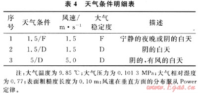 采用QRA計(jì)算中常使用的2種大氣穩(wěn)定度D、F,對(duì)3種天氣條件進(jìn)行分別計(jì)算。主要的天氣條件如表4。