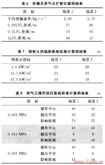 各場景泄漏、擴(kuò)散、火災(zāi)和蒸氣云延遲爆炸的計(jì)算結(jié)果見表6~8。