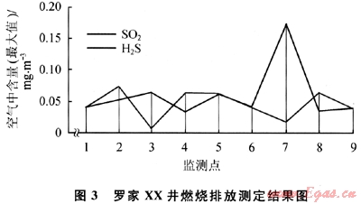從分離器分離出來的高含硫氣體,如果直接排放到大氣中會造成嚴(yán)重的環(huán)境污染,需要進(jìn)行燃燒排放處理。但是現(xiàn)有的資料和現(xiàn)場情況表明,燃燒排放處理難以保證實(shí)現(xiàn)有毒有害氣體的零排放,對環(huán)境仍會造成污染。為了搞清楚高含硫天然氣燃燒排放后的大氣環(huán)境情況,分別在羅家X井和羅家XX井利用試井過程進(jìn)行了燃燒排放實(shí)驗(yàn)。其中,羅家XX井(H2S含量為133.37g/m3)燃燒排放時環(huán)境空氣中S02和H2S測定結(jié)果如圖3所示。