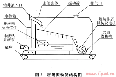 根據(jù)上述方案,完成了密閉振動篩結(jié)構(gòu)設(shè)計。采用的技術(shù)方案是:將振動篩置入一個密閉的金屬殼體內(nèi),殼體置于橇座上,不但能防止H2S外泄,同時也便于吊裝和運(yùn)輸;殼體內(nèi)設(shè)置巖屑收集槽和螺旋排屑機(jī)構(gòu)、集液槽和液位檢測儀,便于及時排屑、排液;排屑電機(jī)和排液鉆井液泵、電控箱安裝在殼體外,避免在高濃度H2S氣體環(huán)境下發(fā)生燃爆;殼體上部設(shè)置通氣法蘭,便于連接抽氣設(shè)備排出殼體內(nèi)高濃度的H2S氣體。