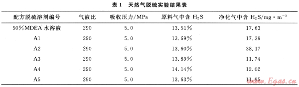 通過實(shí)驗(yàn)測試氨洗脫硫前后高含硫天然氣中硫化氫濃度的變化,可以評價高含硫天然氣氨洗脫硫效果。表1為幾種脫硫溶劑對高含硫天然氣的脫硫?qū)嶒?yàn)效果。