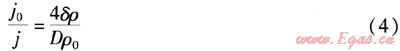 雜散電流流入土壤以后就會產(chǎn)生地電場,土壤中不同地電位之間便有電流流動,兩個不同區(qū)域之間電位差越大,電流就越大。當(dāng)土壤全部都是均勻的介質(zhì)時,電流分布也相對均勻。如果土壤中埋置有油氣管道時,管道中的雜散電流密度與土壤中的雜散電流密度之比見式(4)[2、3]:
