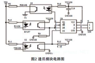 本機(jī)有時需外接工控機(jī)進(jìn)行精準(zhǔn)測量,所以本機(jī)留有RS485接口用于通訊??紤]到通訊可靠和操作員的安全,本機(jī)通訊接口采用了光電隔離。通訊模塊電路布置如圖2。