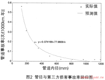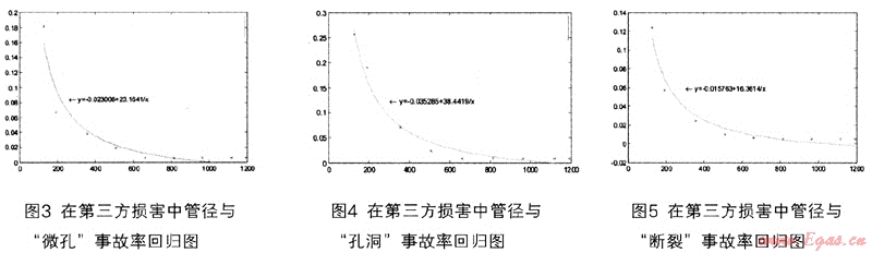 根據(jù)表2數(shù)據(jù)以管徑為自變量(橫坐標(biāo)),事故率為因變量(縱坐標(biāo))繪制散點(diǎn)圖,觀察散點(diǎn)圖發(fā)現(xiàn)事故率與管徑存在遞減的函數(shù)關(guān)系,可以利用曲線線性回歸分析的辦法進(jìn)行試算,可供選擇和函數(shù)關(guān)系有:冪函數(shù)y=xa、指數(shù)函數(shù)y=ax、對(duì)數(shù)函數(shù)y=logax。經(jīng)過試算發(fā)現(xiàn)冪函數(shù)的擬合效果最好,確定為事故率回歸分析的函數(shù)類型。