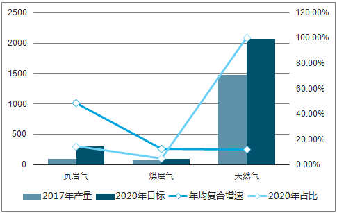 2017 年全年,我國天然氣產(chǎn)量為 1474.2 億立方米,其中常規(guī)天然氣 1312.5 億立方米,頁巖氣 91.5 億立方米,煤層氣 70.2 億立方米,煤制氣 22 億立方米?!短烊粴獍l(fā)展“十三五”規(guī)劃》提出,到 2020 年天然氣國內(nèi)年產(chǎn)量要達(dá)到 2070 億立方米,復(fù)合增速 8.9%,而頁巖氣年產(chǎn)量要達(dá)到300 億立方米,復(fù)合增速 45%,煤層氣年產(chǎn)量達(dá)到 100 億立方米,復(fù)合增速 18%,非常規(guī)天然氣產(chǎn)量占全國產(chǎn)量的比重要至少提高到 19.3%。另外,根據(jù)預(yù)測,我國非常規(guī)氣將成為未來我國天然氣增產(chǎn)主力,其中頁巖氣產(chǎn)量到 2030 年達(dá)到 700 億立方米,到 2050 年達(dá)到 1000 億立方米,煤層氣產(chǎn)量到 2050年將達(dá)到 350 億立方米。