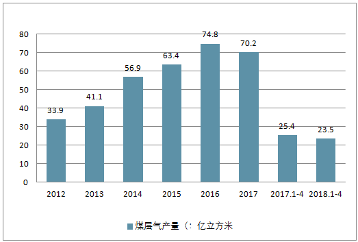 2017 年我國共實現(xiàn)煤層氣產(chǎn)量 70.2 億立方米, 2012-2017年年均復(fù)合增長率為 15.7%,同時今年前四個月累計產(chǎn)量為 23.5 億立方米,同比增速為 8%(可能由于統(tǒng)計口徑問題,實際數(shù)據(jù)較 2017 年略有下降)。