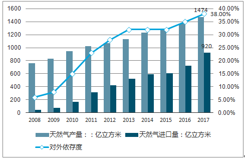 2008-2017 年,我國天然氣進(jìn)口量由 46 億方增長至 920 億方,年均復(fù)合增速 34.9%,而在產(chǎn)量方面, 2008 年我國天然氣產(chǎn)量為 803 億立方米, 2017 年則達(dá)到了 1474 億立方米,年均復(fù)合增長率為 6.97%,遠(yuǎn)低于進(jìn)口量與消費量的增長水平。隨著進(jìn)口量的不斷增加,我國天然氣行業(yè)對外依存度也由 2008 年的 5.9%提高到 2017 年的 38%。