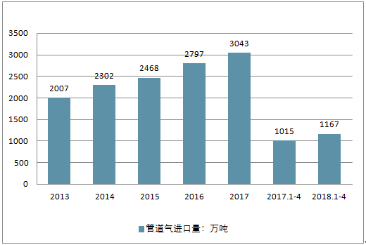 2017 年全年我國共進(jìn)口管道氣3043 萬噸(約合 408 億立方米)。