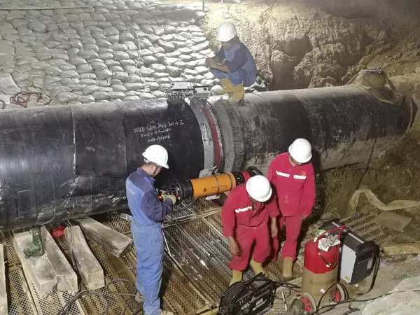 DR(數(shù)字射線)檢測焊口。DR(數(shù)字射線)檢測技術(shù)利用X射線的穿透特性和衰減特性,通過探測器獲得可被顯示和記錄的數(shù)字圖像。與傳統(tǒng)射線檢測技術(shù)相比,能夠在成像環(huán)節(jié)減少時間,同時在根焊、熱焊、填充一遍完成后進(jìn)行DR檢測,確保了焊縫根部焊接質(zhì)量。
