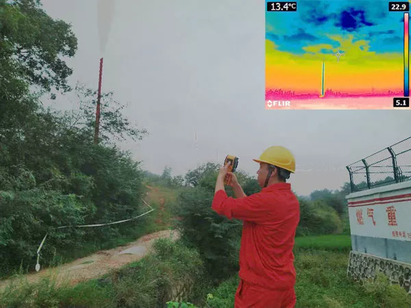 紅外熱成像儀監(jiān)測放空。因天然氣放空的節(jié)流效應(yīng),冷放空天然氣溫度與附近大氣存在一定差值,紅外熱成像儀將被測目標(biāo)的紅外輻射能量分布圖反映到光敏元件上,從而獲得紅外熱像圖。使用熱成像圖可監(jiān)測天然氣在大氣中的擴(kuò)散,發(fā)現(xiàn)異常情況可及時進(jìn)行工藝調(diào)整,確保風(fēng)險受控。